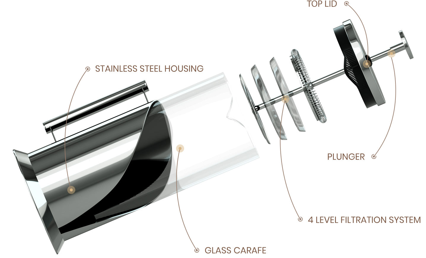 The Cafe Du Chateau French Press has a 4 level filtration system. We use 2 stainless steel screen filters supported by a spring loaded base plate to seal the edges, followed by a final lid strainer to make sure you have a pure brew with no grounds.